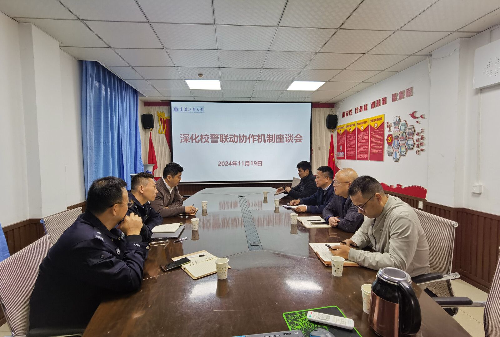 11月19日,南岸区公安分局反诈中心与四公里派出所到2138cc太阳集团官网(保卫处)沟通反诈宣传教育工作,保卫处沙云处长、邱胜祥副处长、学生处及信息技术中心相关老师参加。座谈会上,双方就如何推行新型宣传手段提高反诈宣传效果进入了深入交流,探讨了反诈宣传工作中遇到的问题,就推进新的宣传手段达成了共识。