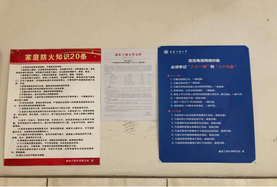 活动期间,悬挂宣传标语11幅;张贴宣传画报200余份;利用平安校园信息发布平台发布安全知识1期,实行全天候滚动播出;利用LED平台发布安全知识3期,实行全天候滚动播出;发出警情通报1份;3月26日上午10时,在南岸校区博智楼门前,保卫处会同南岸分局服务学校29条办公室、四公里派出所发放宣传资料4000余份,公安民警还为师生提供了现场咨询服务。
