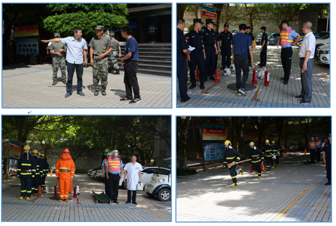 在演练现场,物业值班人员得知并确认宏智楼发生火灾后立即用对讲机向保卫科报警,保卫科负责人下令启动应急预案,物业值班人员接到指令后,立即关闭大楼电源,并组织指挥学生分别从大楼内部两侧的通道有序疏散。同时,物业人员携带灭火器、水带、消防斧等器材从大门进入到四楼着火点灭火。在得知1名学生在“火灾”中“受伤”后,物业人员与医生即刻携带担架进入到楼栋,抬出受伤学生。14:45左右,楼内3000余名师生全部疏散到楼外安全区域,“大火”被扑灭,无人员“伤亡”,演练取得圆满成功。