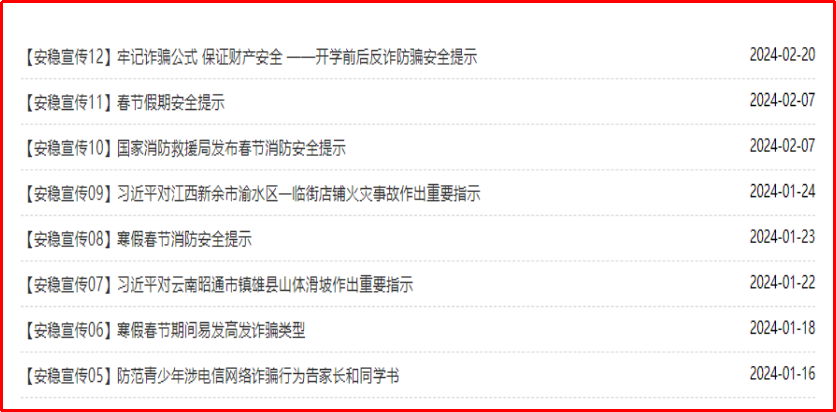 线上,在校园网发布【安稳宣传】8期:《防范青少年涉电信网络诈骗行为告家长和同学书》《寒假春节期间易发高发诈骗类型》《寒假春节消防安全提示》《习近平对云南昭通市镇雄县山体滑坡作出重要指示》《习近平对江西新余市渝水区一临街店铺火灾事故作出重要指示》《国家消防救援局发布春节消防安全提示》《春节假期安全提示》《牢记诈骗公式 保证财产安全 ——开学前后反诈防骗安全提示》。利用微信公众号发布推文6条,开展了反诈防骗、消防安全等宣传教育。持续开展反诈防骗宣传教育,线上推送反诈警情29条,预警劝阻58人次。线下,张贴《寒假春节安全提示》30份,展出消防安全展板5块,并在校园安全宣传平台全天候滚动播放火灾防控相关知识。常态化开展反诈防骗、消防安全、应急演练等宣传教育培训。开展各种培训演练8次,参与人员265人次。发布预警信息28条。组织25名安保大队队员进行森林灭火应急演练1次;选派安保队员和物业人员共11人参加辖区消防救援站开展的养老院及学校单位员工培训1次。