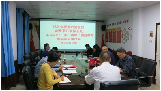 2019年9月30日至10月8日,机关党委第六党支部组织支部全体党员、干部、校园安保服务大队党员和其他队员开展了“不忘初心、牢记使命”主题党日活动。9月30日下午,支部全体党员、干部、安保大队队长一同前往学校含弘广场,举行了“我与国旗同框”活动,在国旗下留下了宝贵的集体照片。10月1日上午,支部党员钱忠坤、邱胜祥、吴佳、王树坤、安保大队队长、安保大队中的党员以及其他参与执勤的15名队员在含弘广场参加了学校升旗仪式。10月1日—7日,支部党员、干部自行开展了以学习《习近平总书记在庆祝中华人民共和国成立70周年大会上的重要讲话》为主的学习活动。10月8日上午,在党员活动室开展了“不忘初心、牢记使命”主题教育集中学习研讨会。会上,支部书记钱忠坤同志首先检查了支部党员自学《习近平关于“不忘初心、牢记使命”论述摘编》情况,并进行了讲评;邱胜祥副同志领学了《习近平总书记在国家勋章和国家荣誉称号颁授仪式上的讲话》《习近平总书记在庆祝中华人民共和国成立70周年招待会上的讲话》,钱忠坤同志领学了《习近平总书记在庆祝中华人民共和国成立70周年大会上的讲话》;全体党员、干部结合开展的系列活动,特别是针对学习习近平总书记重要讲话和观看庆祝大会和联欢晚会的情况,进行了交流发言。