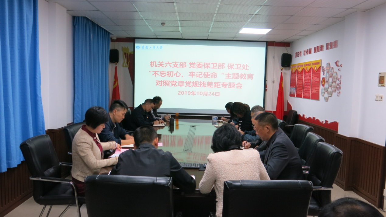10月24日上午,机关六支部在支部党员活动室召开“不忘初心、牢记使命”主题教育对照党章党规找差距专题会,支部全体党员、保卫部处全体干部参加了会议。会议由支部书记钱忠坤主持,党委组织部副部长、学校主题教育巡回指导一组成员林文军、联络员田静到会指导专题会。