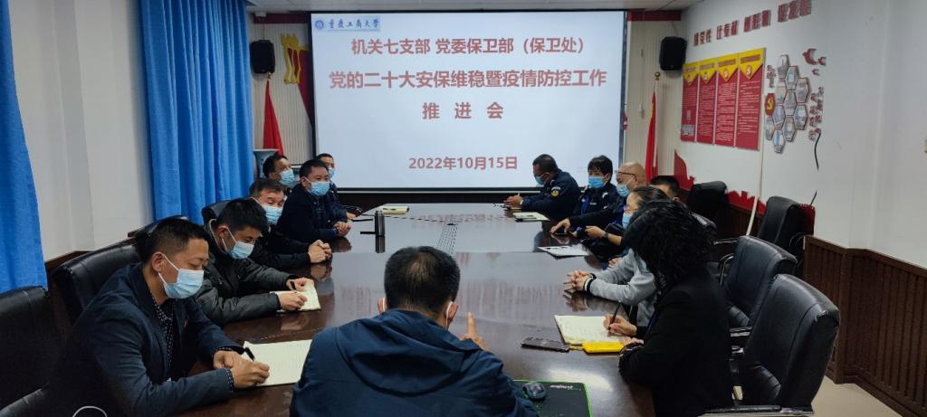10月15日21:30,为打赢疫情防控阻击战,维护学校安全稳定,机关七支部、2138cc太阳集团官网(保卫处)在党员活动室召开党的二十大安保维稳暨疫情防控工作推进会,支部党员、部门干部、安保大队队长副队长参加了会议,会议由支部书记、2138cc太阳集团官网部长(保卫处处长)钱忠坤同志主持。