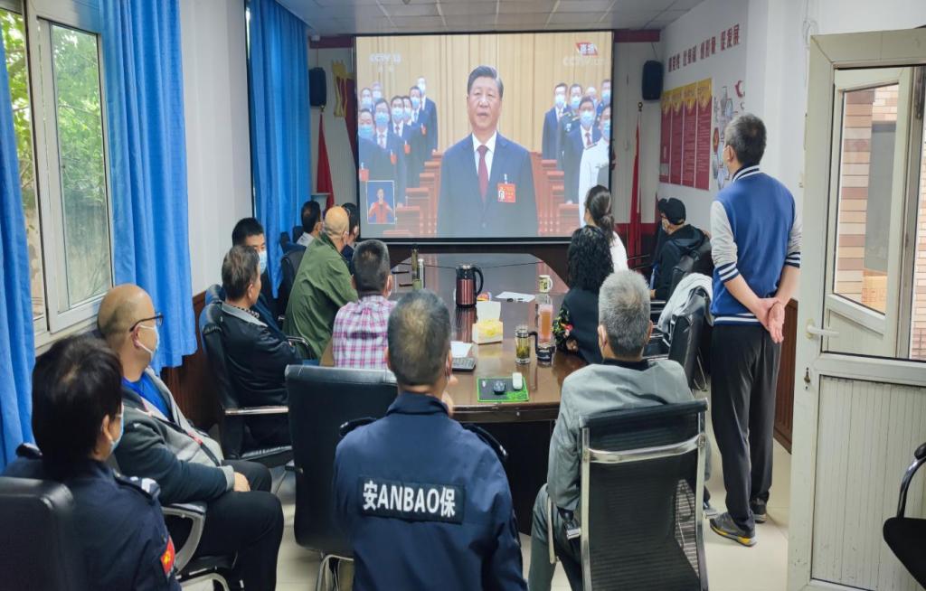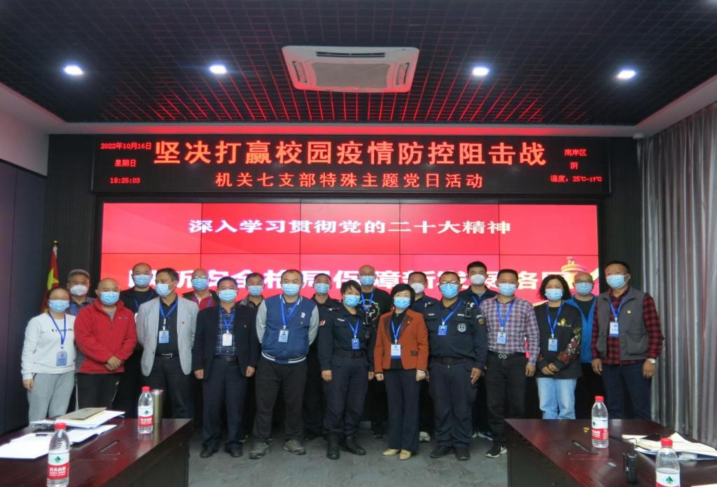 2022年10月16日,是非常特殊的一天,上午10点,我们期盼已久的党的二十大胜利开幕,同时,在学校党委和行政的坚强领导下,学校疫情防控阻击战进入到第六天的关键时期。为进一步提振大家的精气神,进一步激发大家的战斗热情,机关七支部全体党员、干部、安保大队队长副队长在党员活动室、工作岗位上、监控指挥中心开展了一次特殊的主题党日活动。学校党委副书记宋豫同志以普通党员身份参加了活动,学校党委常委、组织部部长郑夕春同志到场参加并指导活动的开展。此次特殊党日活动的主题是“深入学习贯彻党的二十大精神,以新安全格局保障新发展格局,坚决打赢校园疫情防控阻击战”。