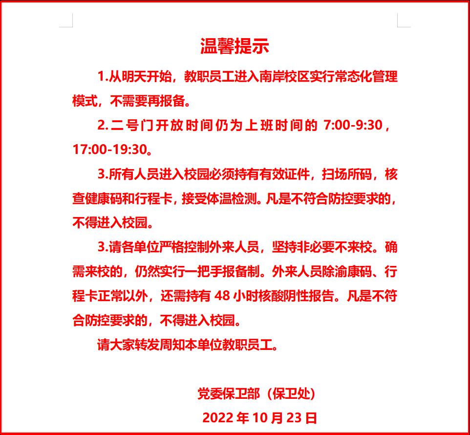 20:45,钱忠坤发布《南岸校区实行常态化管理的温馨提示》,要求安保大队领会精神,认真执行。