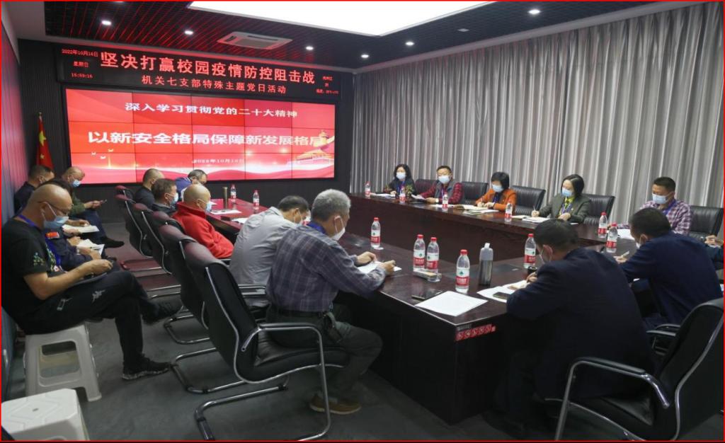 2022年10月16日,是非常特殊的一天,上午10点,我们期盼已久的党的二十大胜利开幕,同时,在学校党委和行政的坚强领导下,学校疫情防控阻击战进入到第六天的关键时期。为进一步提振大家的精气神,进一步激发大家的战斗热情,机关七支部全体党员、干部、安保大队队长副队长在党员活动室、工作岗位上、监控指挥中心开展了一次特殊的主题党日活动。学校党委副书记宋豫同志以普通党员身份参加了活动,学校党委常委、组织部部长郑夕春同志到场参加并指导活动的开展。此次特殊党日活动的主题是“深入学习贯彻党的二十大精神,以新安全格局保障新发展格局,坚决打赢校园疫情防控阻击战”。