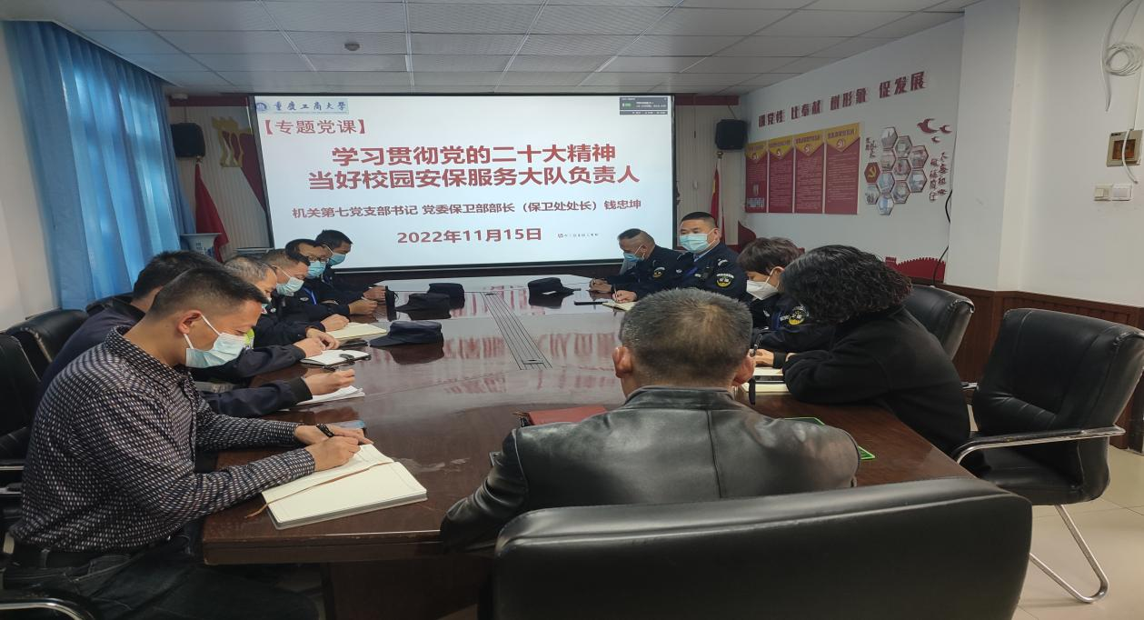 为深入学习贯彻党的二十大精神,11月15日下午,机关第七党支部书记、2138cc太阳集团官网部长(保卫处处长)钱忠坤在支部党员活动室以“学习贯彻党的二十大精神 当好校园安保服务大队负责人”为题目,为校园安保服务大队队长、副队长、班长和党员代表讲授了党课。支委委员王树坤、曹晓丽、何炫梁参加了党课。