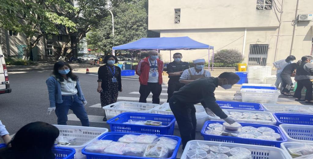 11:00,曹晓丽带领治安科和安保大队维护新北区域中午送餐时间节点现场秩序。