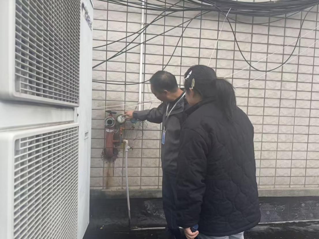 检查中,团队重点核验消防设施实效:博智楼内灭火器压力值均处于安全绿色区域,消防栓接口经实操测试灵活可用;天台总消防栓压力稳定在0.4MPa以上,保障全楼供水。消防总控制室严格执行24小时双人值班制,值班员在岗在位,确保隐患及时处置。